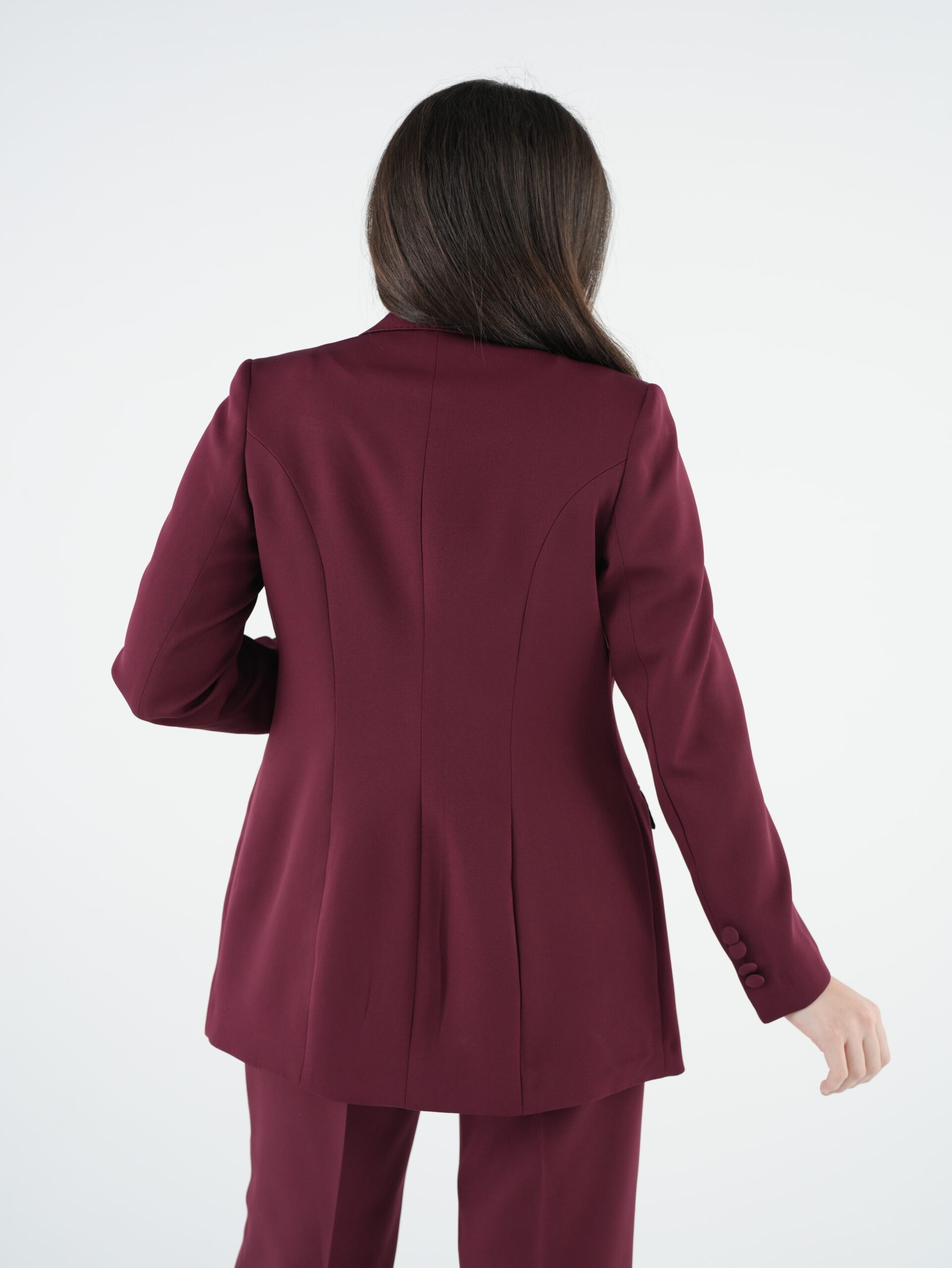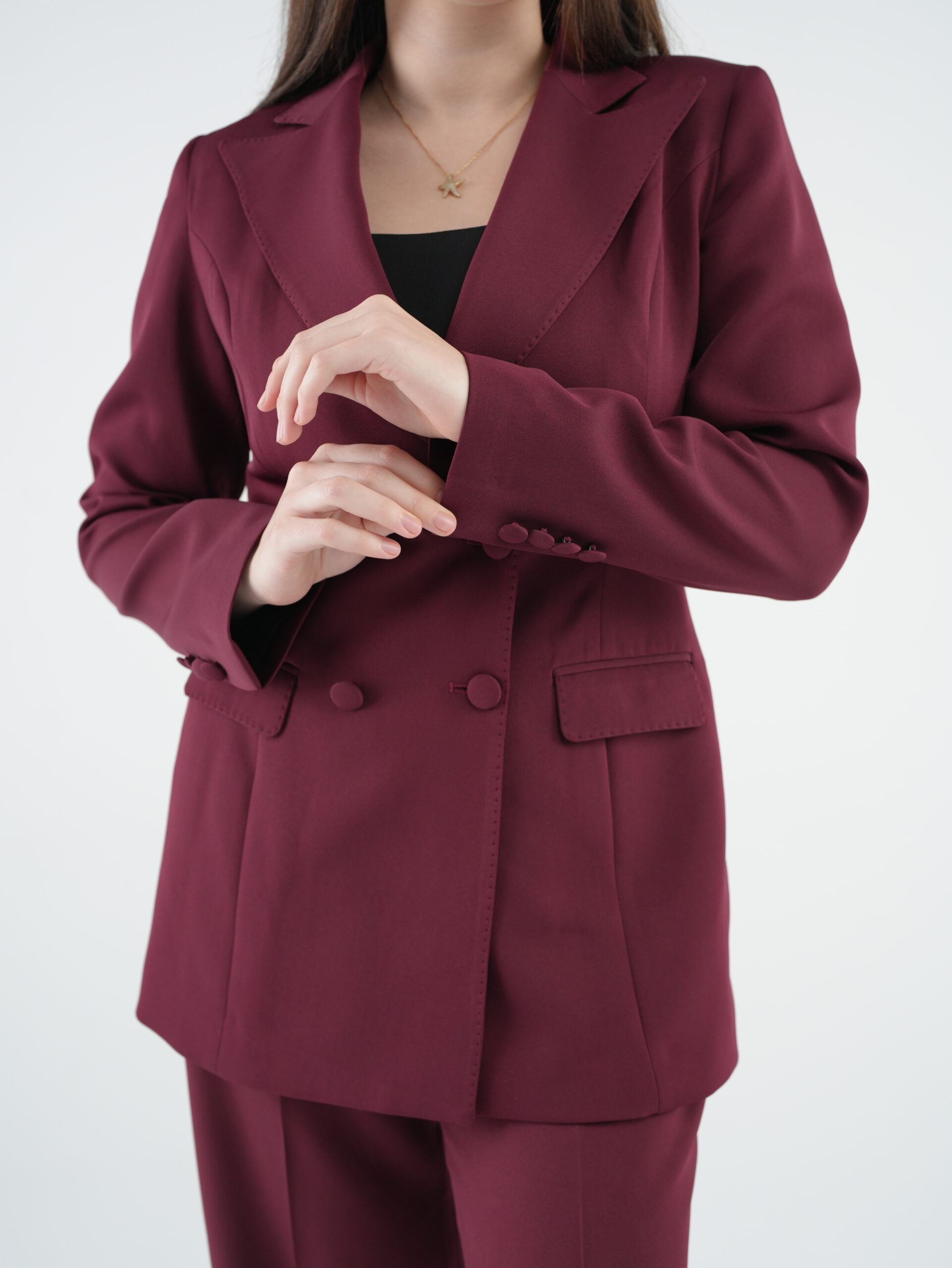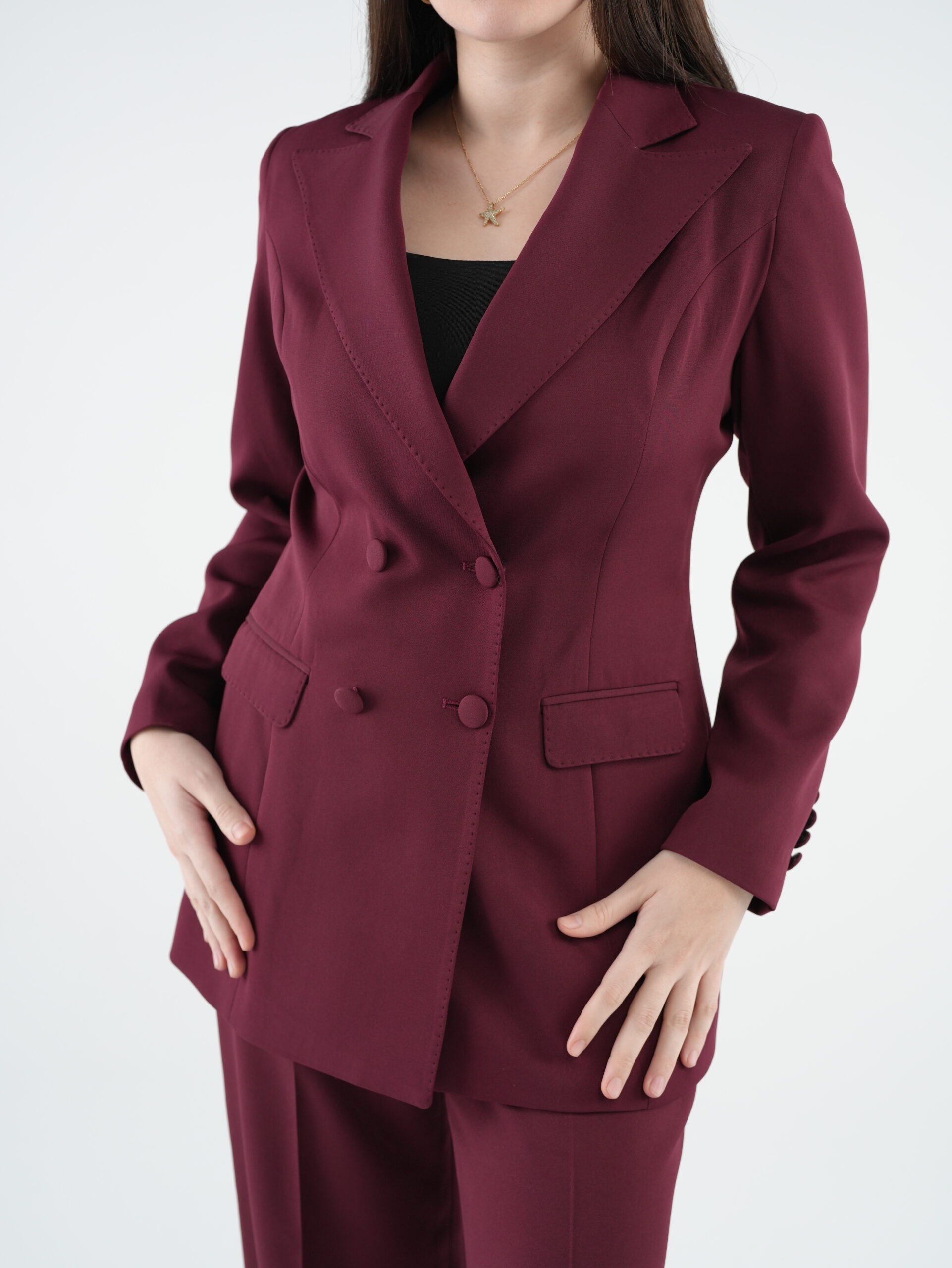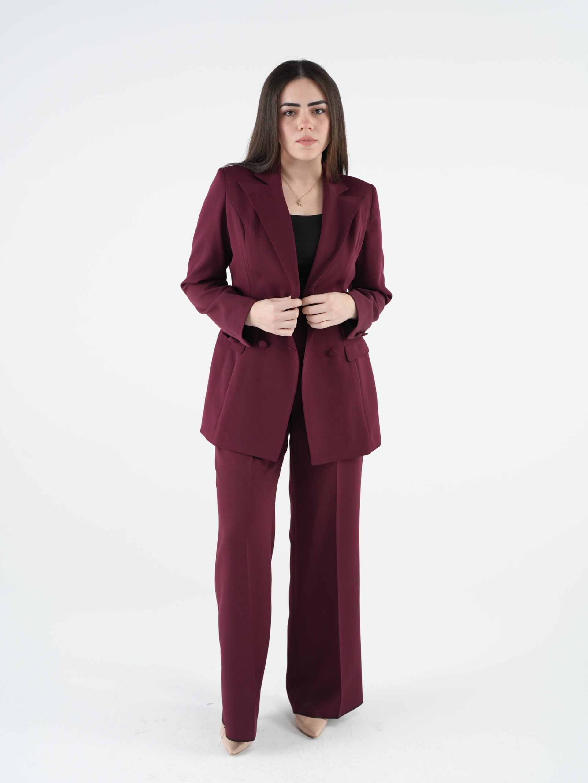 Designed with modern sophistication, this burgundy women’s suit features a structured silhouette and clean tailoring that flatters the figure. Its classic, elegant design ensures a polished look suitable for work, business meetings, or chic daily wear.
