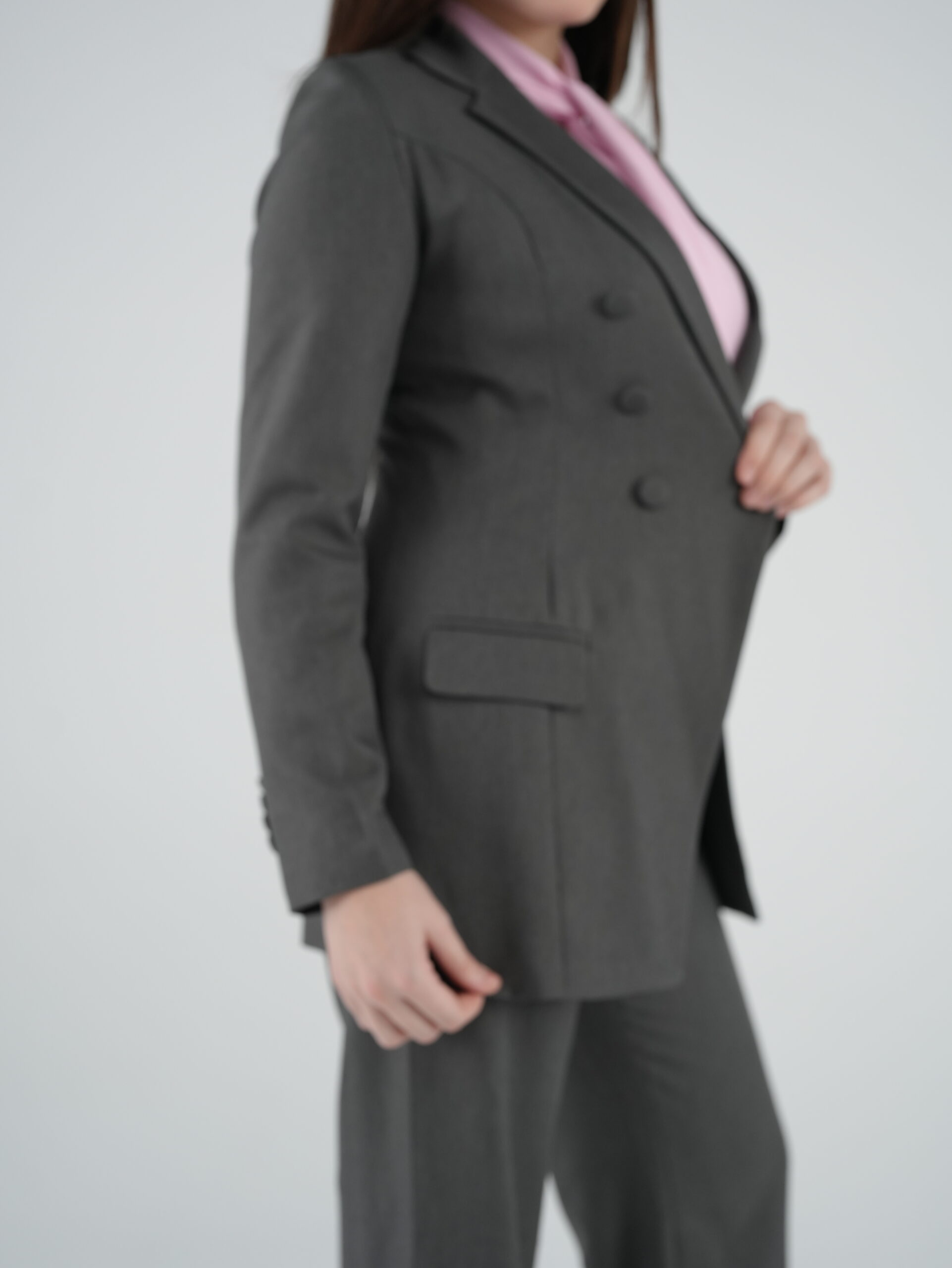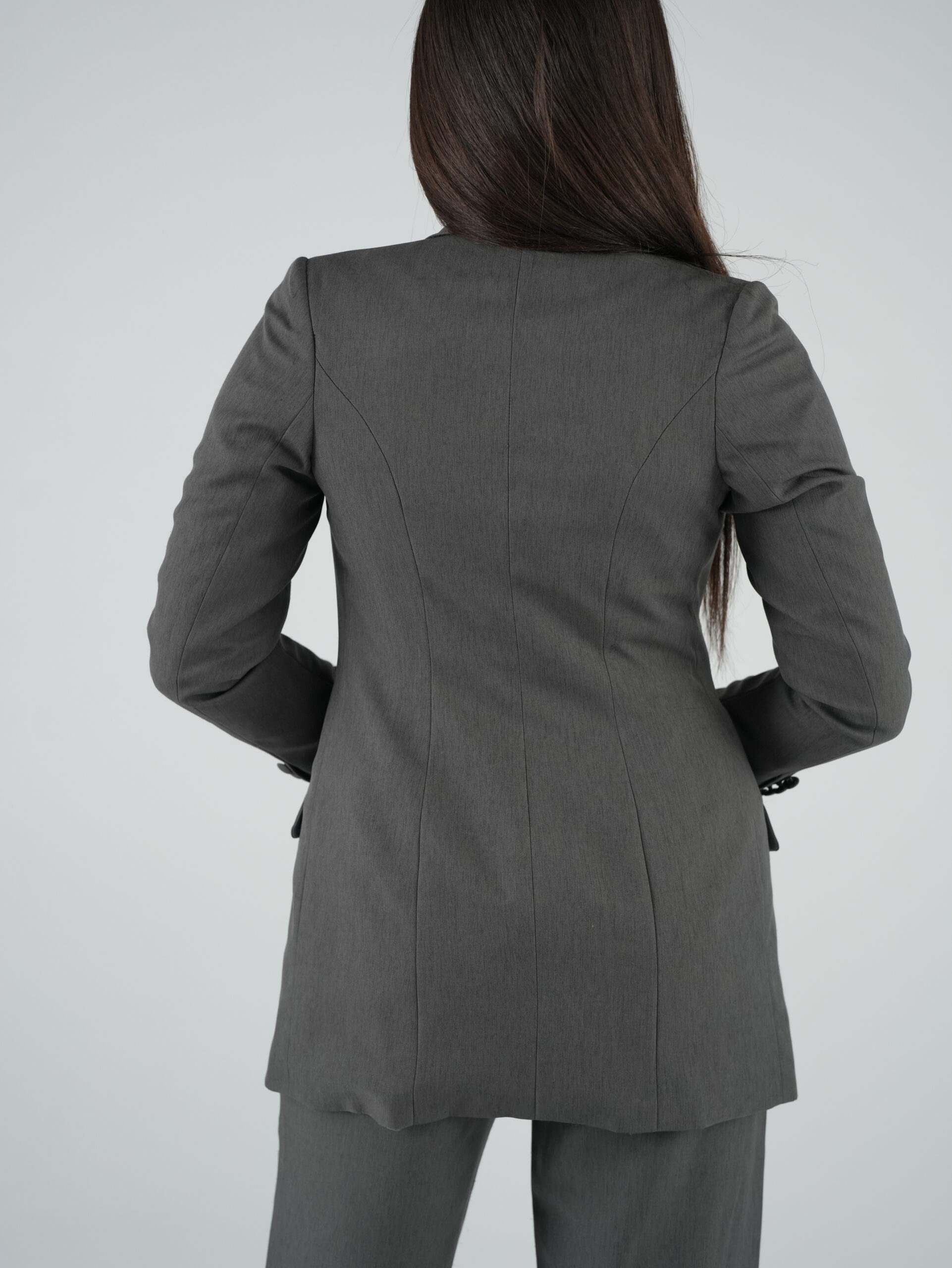 Designed with modern sophistication, this gray women’s suit features a structured silhouette and clean tailoring that flatters the figure. Elegant quilted buttons add a stylish, distinctive touch, making it perfect for office wear, business meetings, or formal events.